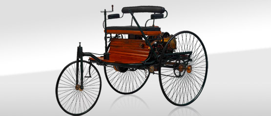 德国 1885年,卡尔·本茨试制了一台单缸四冲程汽油机,并安装在由钢管和木板构成的三轮车架上。它采用了钢质条幅轮圈和实心橡胶轮胎,转向则是采用转动式手柄并且通过齿轮转递前轮来完成的,通过传动带机构和链条来驱动后轮,速度达到每小时15公里。1886年1月29日,是汽车历史上值得纪念的一天,本茨为该车向德国专利局申请了专利。这是一辆经过授权的复制品。